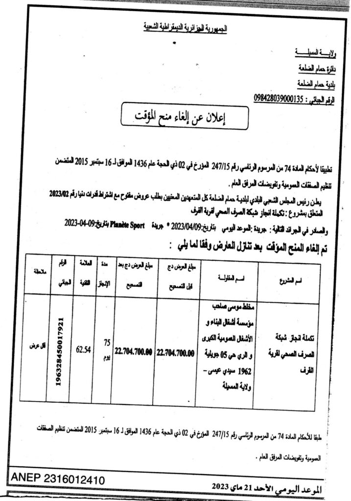 إعلان عن إلغاء منح المؤقت: تكملة انجاز شبكة الصرف الصحي لقرية القرف بلدية حمام الضلعة