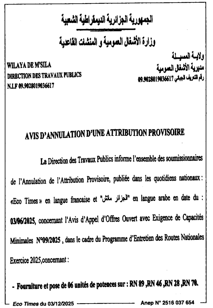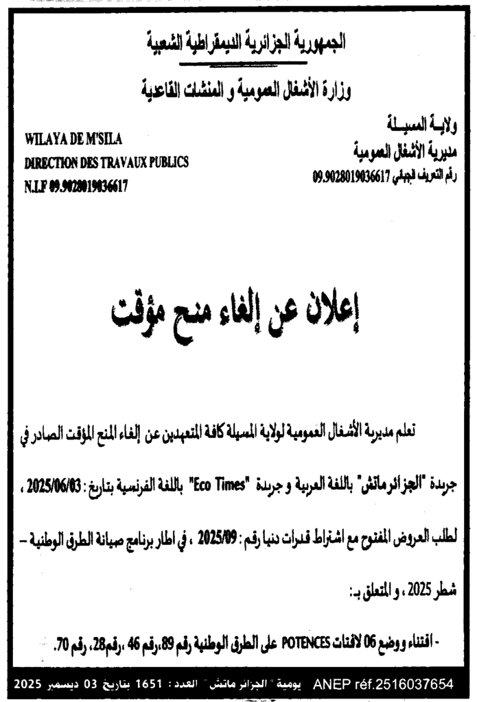 إعلان عن إلغاء منح مؤقت اقتناء ووضع 06 لافتات على الطرق الوطنية/ مديرية الأشغال العمومية لولاية المسيلة