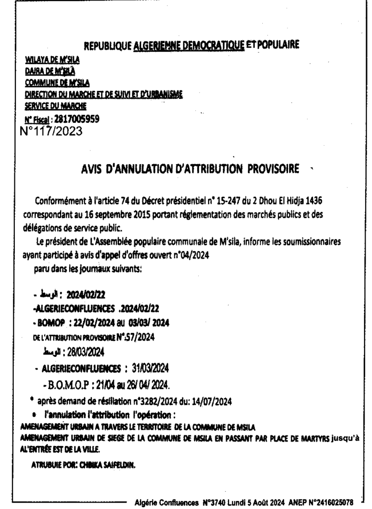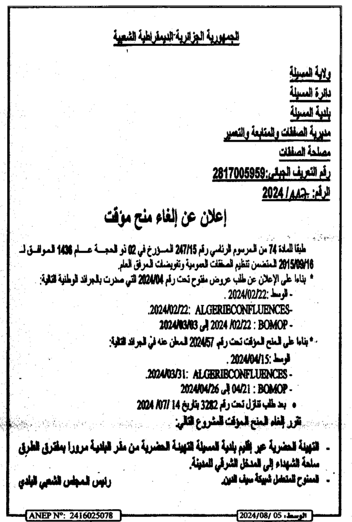 إعلان عن إلغاء منح مؤقت التهيئة الحضرية/ بلدية المسيلة