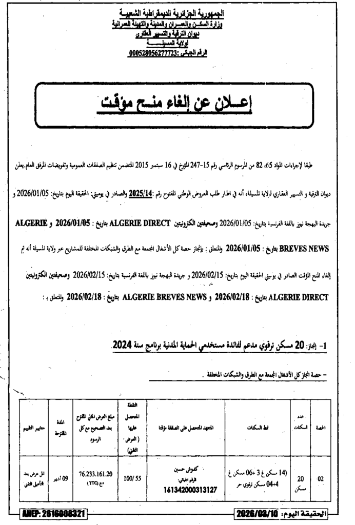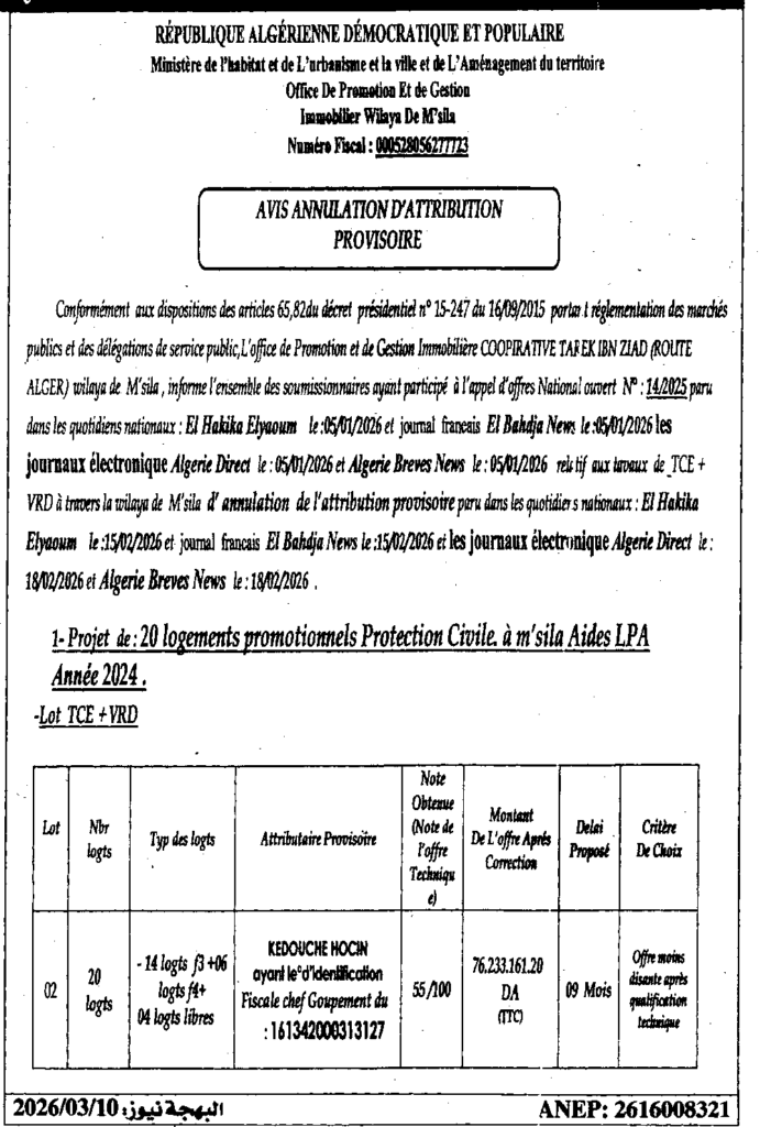 إعلان عن إلغاء منح مؤقت انجاز 20 مسكن مدعم لفائدة مستخدمي الحماية المدنية/ ديوان الترقية والتسيير العقاري لولاية المسيلة