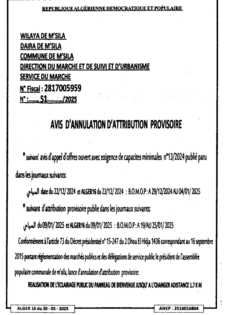 إعلان عن إلغاء منح مؤقت/ بلدية المسيلة