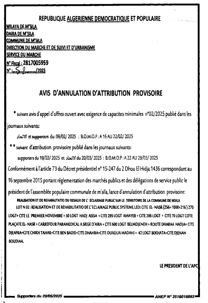 إعلان عن إلغاء منح مؤقت/ بلدية المسيلة