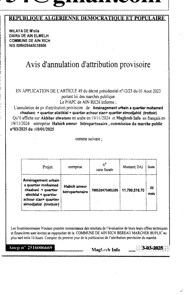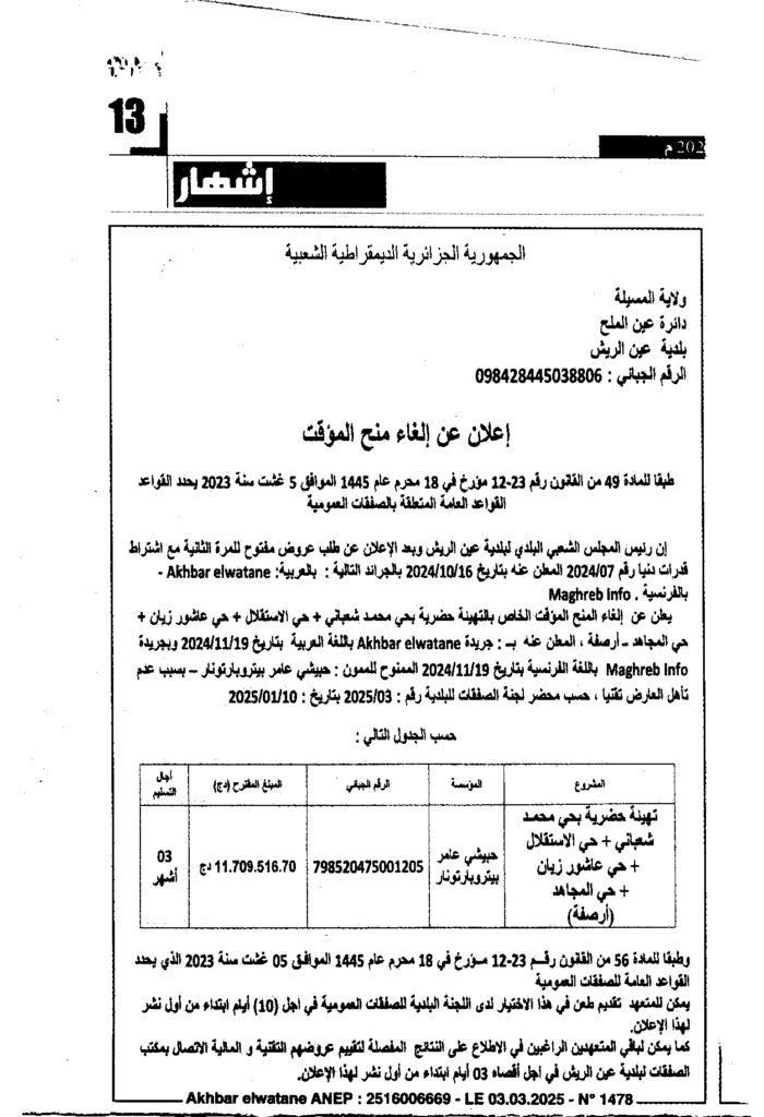 إعلان عن إلغاء منح مؤقت/ بلدية عين الريش