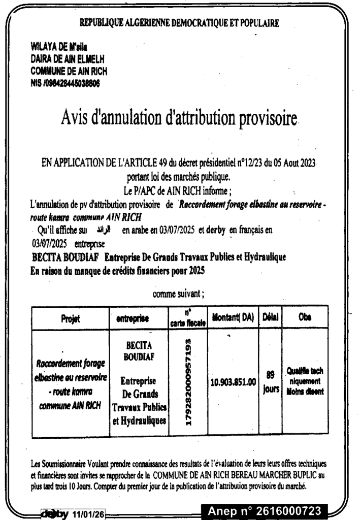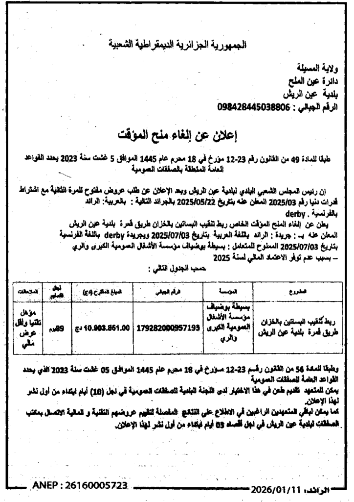 إعلان عن إلغاء منح مؤقت ربط تنقيب البساتين بالخزان/ بلدية عين الريش