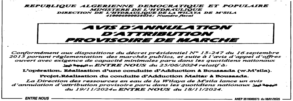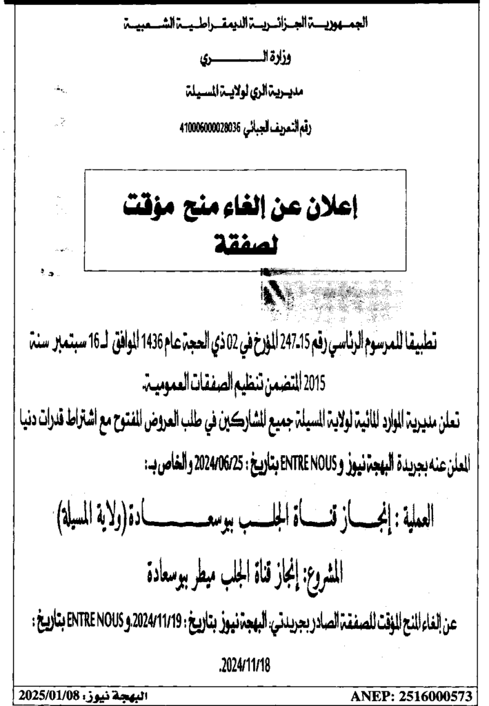 إعلان عن إلغاء منح مؤقت لصفقة انجاز قناة الجلب ببوسعادة/ مديرية الري لولاية المسيلة
