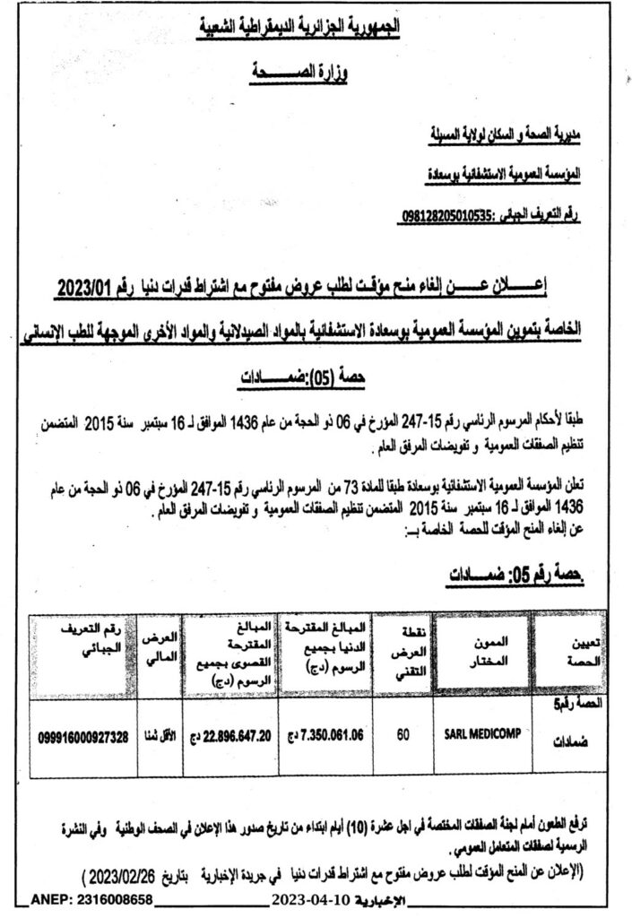 إعلان عن إلغاء منح مؤقت لطلب عروض مفتوح 2023/01 الخاصة بتموين المؤسسة العمومية الاستشفائية بوسعادة بالمواد الصيدلانية والمواد الأخرى الموجهة للطب الإنساني