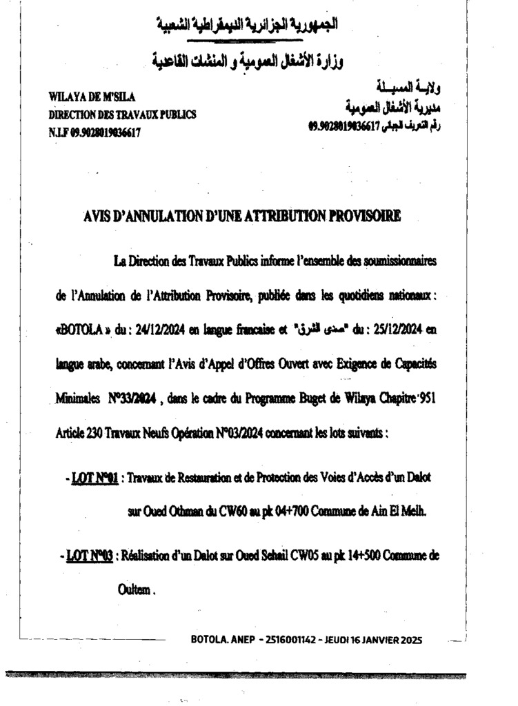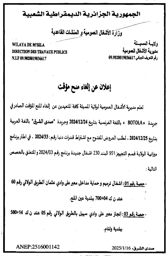 إعلان عن إلغاء منح مؤقت/ مديرية الأشغال العمومية لولاية المسيلة