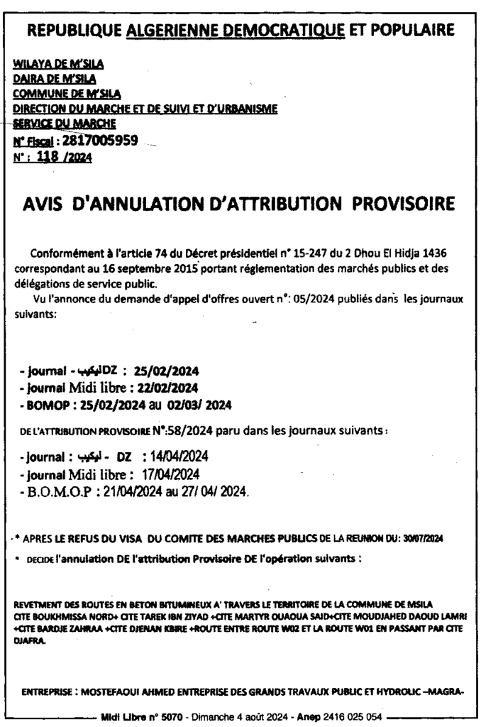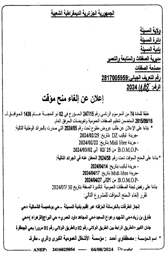 إعلان عن إلغاء منح مؤقت 2024/118 بلدية المسيلة