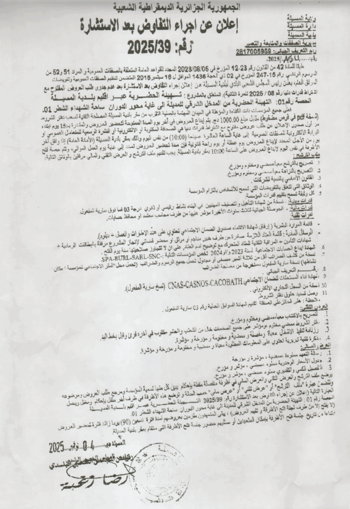 إعلان عن اجراء التفاوض بعد الاستشارة 2025/39 بلدية المسيلة