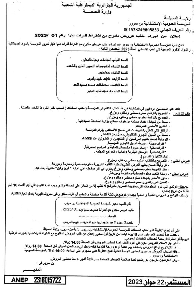 إعلان عن اجراء طلب عروض مفتوح 2023/01 المؤسسة العمومية الاستشفائية بن سرور