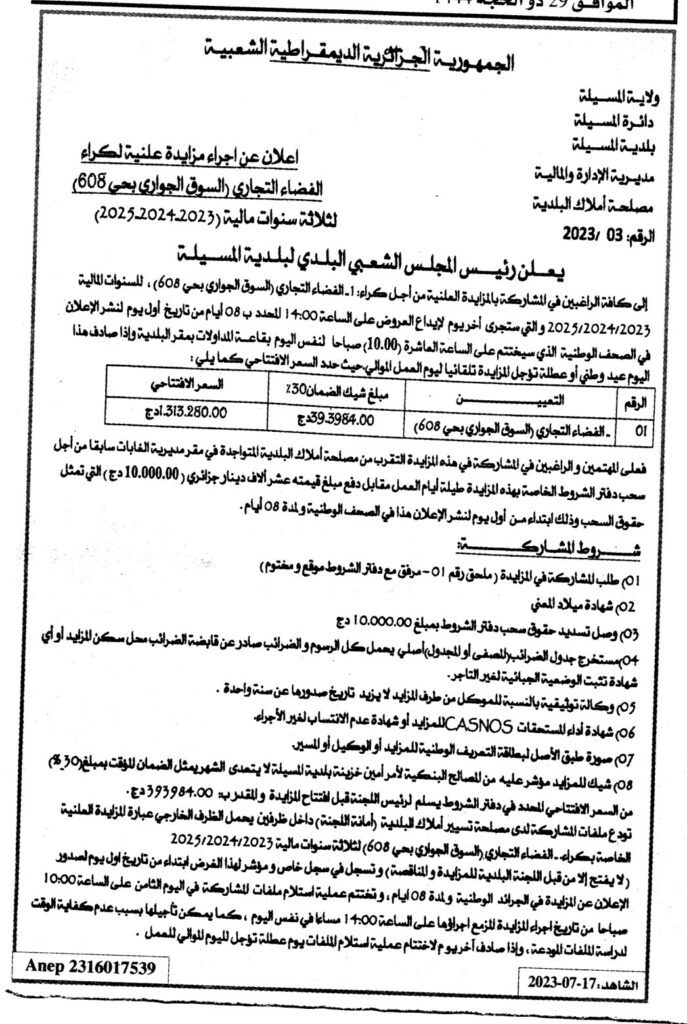 إعلان عن اجراء مزايدة علنية لكراء الفضاء التجاري (السوق الجواري بحي 608) لثلاثة سنوات مالية (2023-2024-2025) بلدية المسيلة