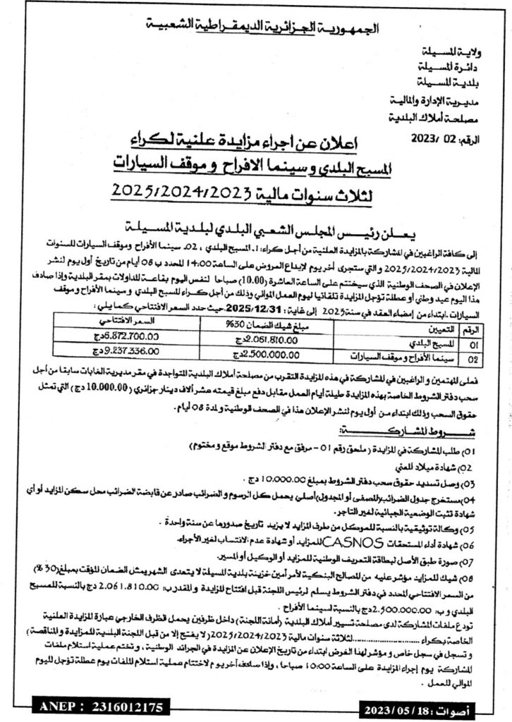 إعلان عن اجراء مزايدة علنية لكراء المسبح البلدي وسينما الأفراح وموقف السيارات لثلاث سنوات مالية 2025/2024/2023 بلدية المسيلة