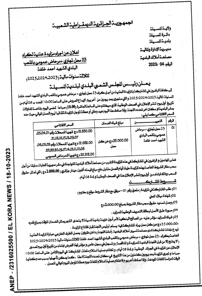 إعلان عن اجراء مزايدة علنية لكراء 23 محل تجاري + مرحاض عمومي بالملعب البلدي الشهيد أحمد خلفة/ بلدية المسيلة