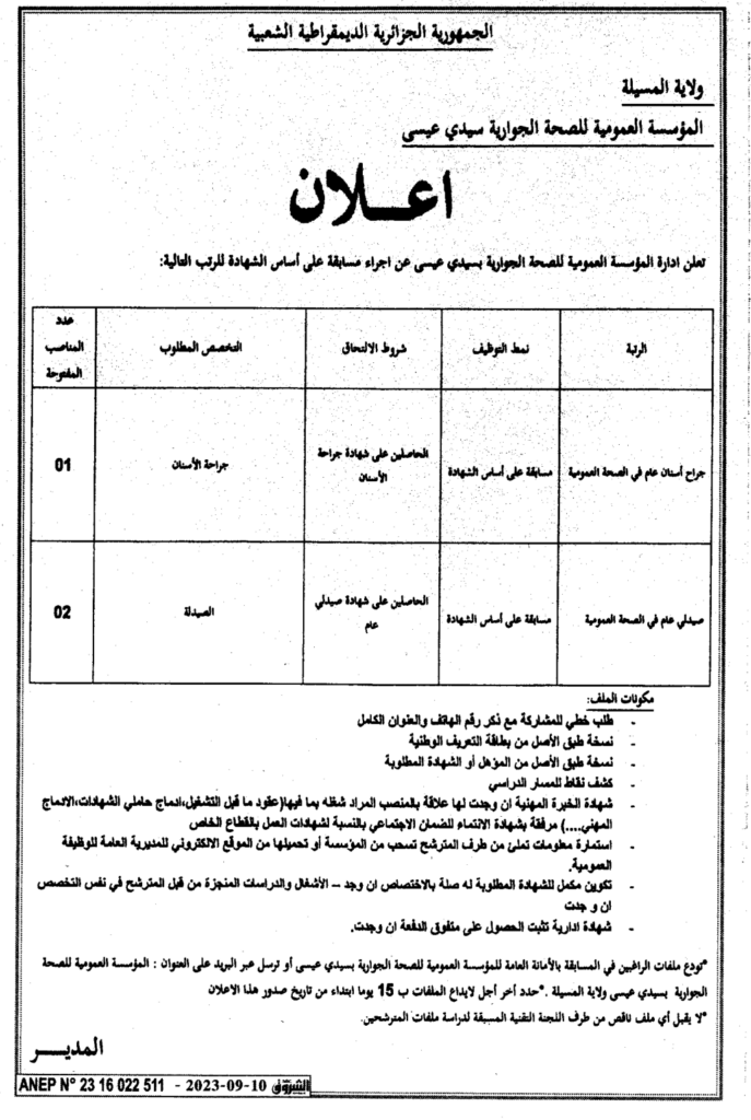 إعلان عن اجراء مسابقة على اساس الشهادة/ المؤسسة العمومية للصحة الجوارية سيدي عيسى