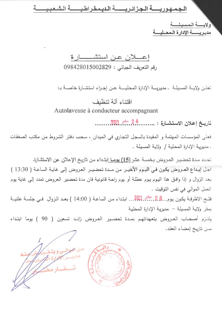 إعلان عن استشارة: اقتناء آلة تنظيف/ مديرية الإدارة المحلية بولاية المسيلة