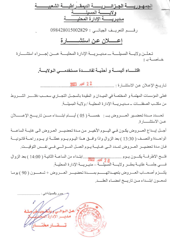 إعلان عن استشارة : اقتناء ألبسة وأحذية لفائدة مستخدمي الولاية/ مديرية الإدارة المحلية لولاية المسيلة