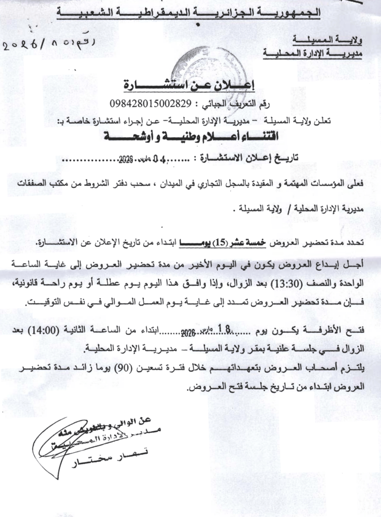 إعلان عن استشارة اقتناء اعلام وطنية وأوشحة/ مديرية الإدارة المحلية لولاية المسيلة