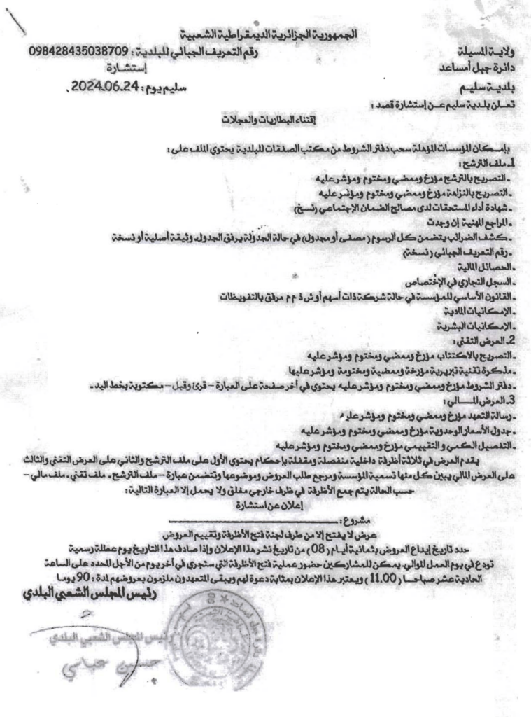إعلان عن استشارة اقتناء البطاريات والعجلات بلدية سليم