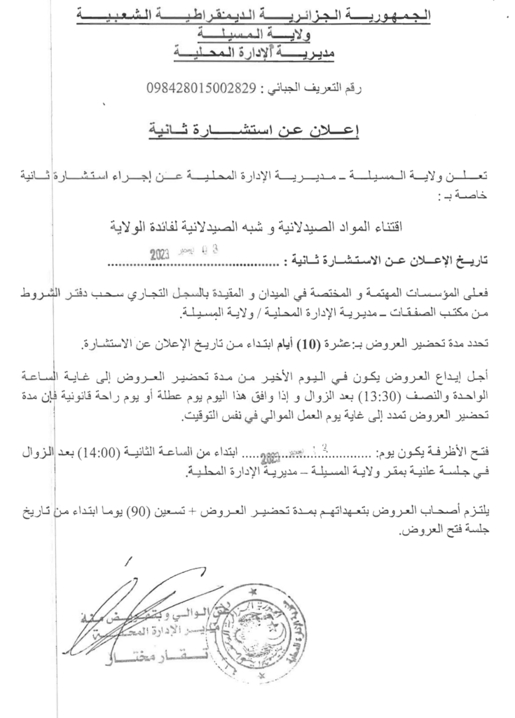 إعلان عن استشارة: اقتناء المواد الصيدلانية وشبه الصيدلانية لفائدة ولاية المسيلة/ مديرية الإدارة المحلية