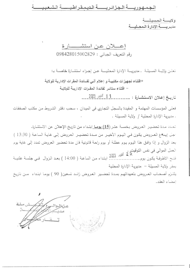 إعلان عن استشارة: اقتناء تجهيزات مكتبية واعلام آلي لفائدة المقرات الادارية للولاية، اقتناء ستائر لفائدة المقرات الادارية للولاية/ مديرية الإدارة المحلية لولاية المسيلة