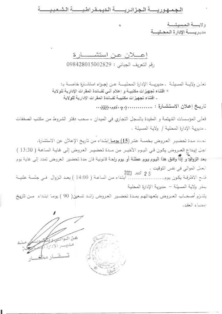 إعلان عن استشارة: اقتناء تجهيزات مكتبية واعلام آلي لفائدة المقرات الادارية للولاية، اقتناء تجهيزات مكتبية لفائدة المقرات الادارية للولاية/ مديرية الإدارة المحلية لولاية المسيلة