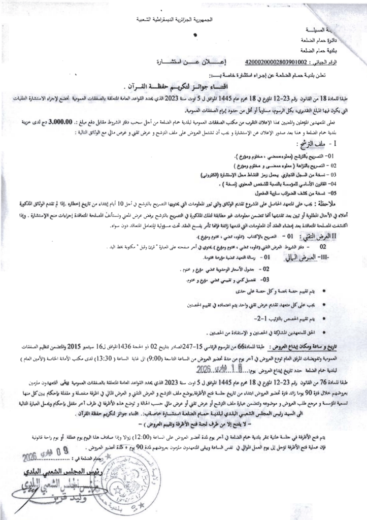 إعلان عن استشارة اقتناء جوائز لتكريم حفظة القرآن/ بلدية حمام الضلعة