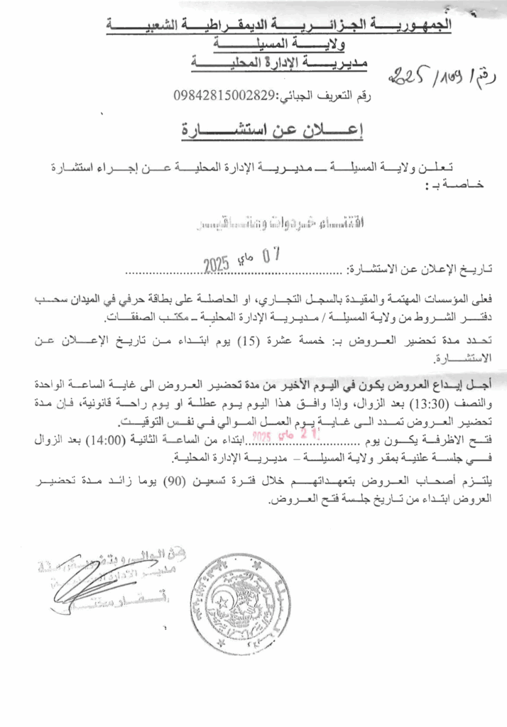 إعلان عن استشارة اقتناء خردوات وعقاقير/ مديرية الإدارة المحلية لولاية المسيلة
