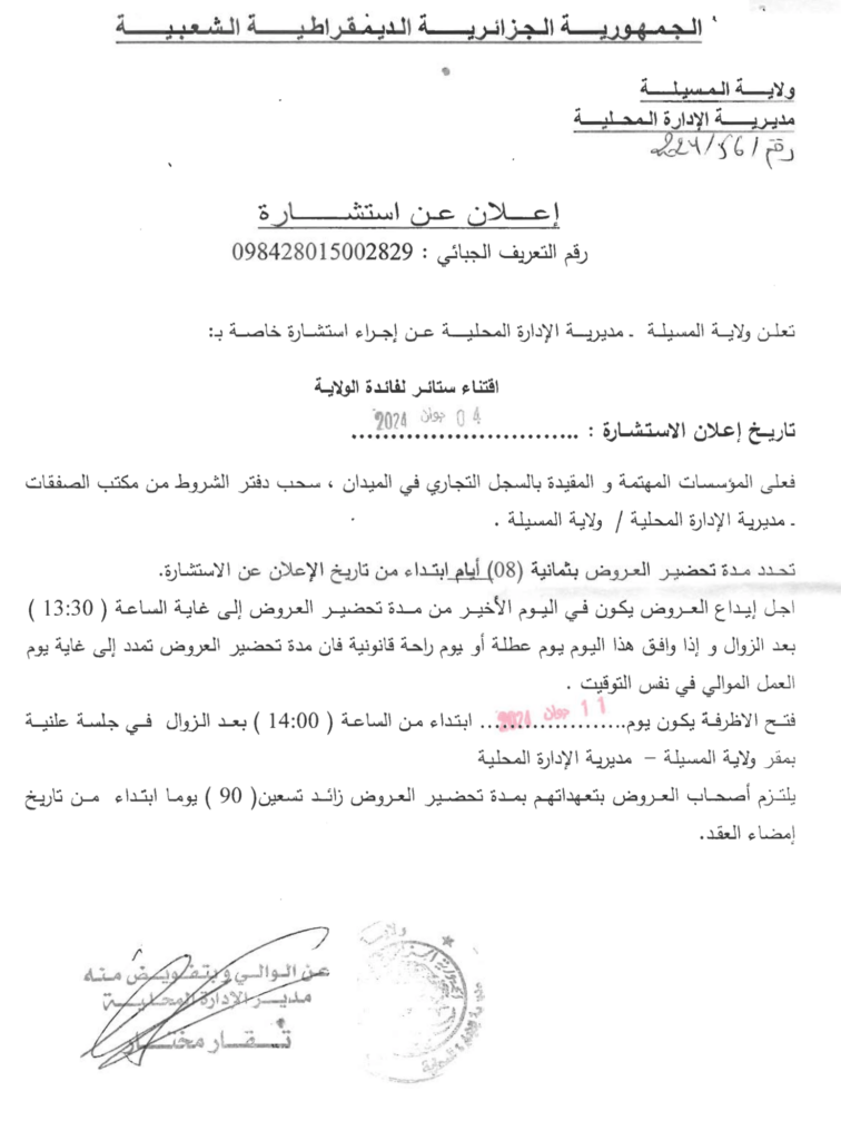 إعلان عن استشارة: اقتناء ستائر لفائدة الولاية/ مديرية الادارة المحلية لولاية المسيلة