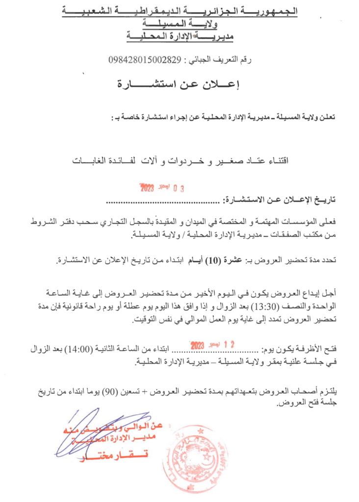 إعلان عن استشارة: اقتناء عتاد صغير وخردوات وآلات لفائدة الغابات/ مديرية الإدارة المحلية