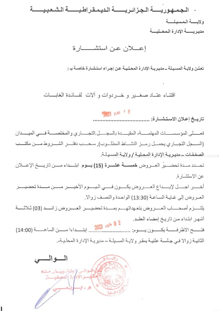 إعلان عن استشارة اقتناء عتاد صغير وخردوات وآلات لفائدة الغابات/ مديرية الإدارة المحلية