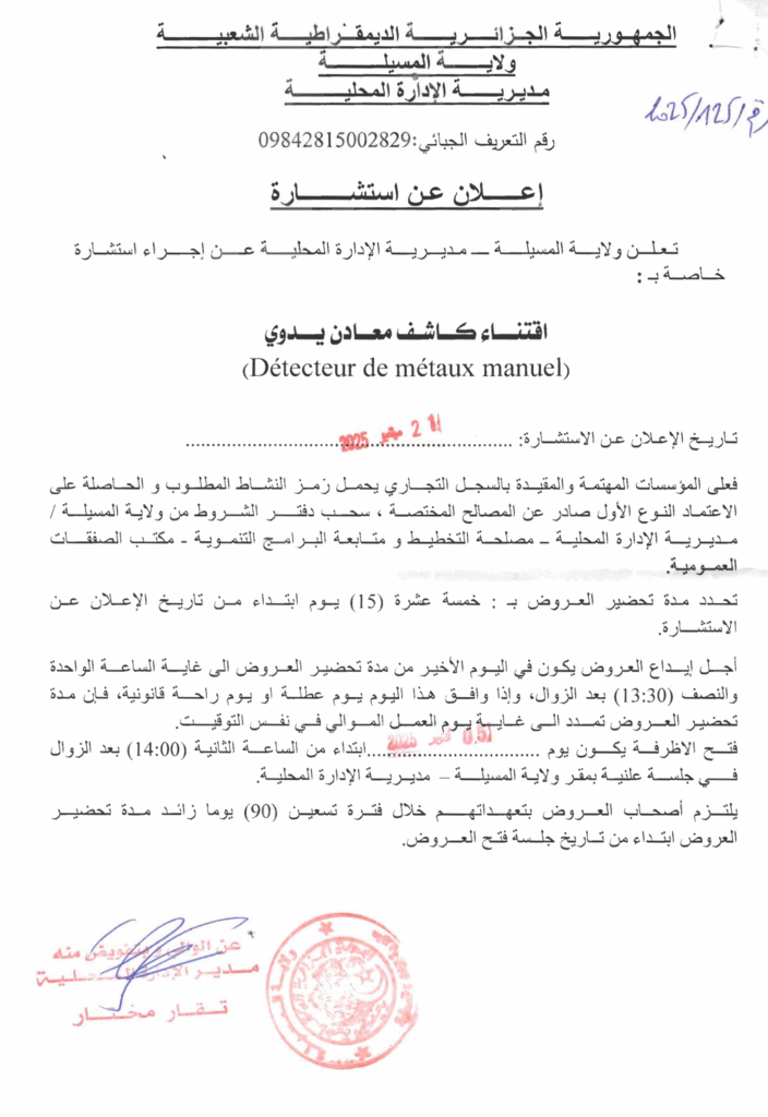 إعلان عن استشارة اقتناء كاشف معادن يدوي/ مديرية الإدارة المحلية لولاية المسيلة