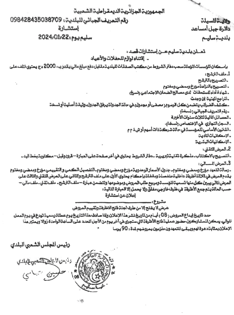 إعلان عن استشارة: اقتناء لوازم للحفلات والأعياد/ بلدية سليم