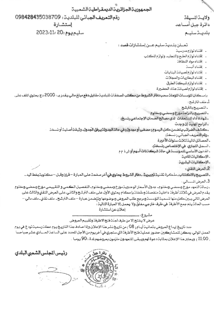 إعلان عن استشارة: اقتناء (لوازم مدرسية-لوازم الطبع والتجليد ولوازم المكتب..)/ بلدية سليم