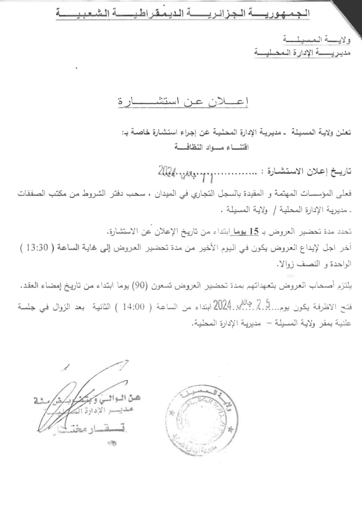 إعلان عن استشارة: اقتناء مواد النظافة/ مديرية الادارة المحلية لولاية المسيلة