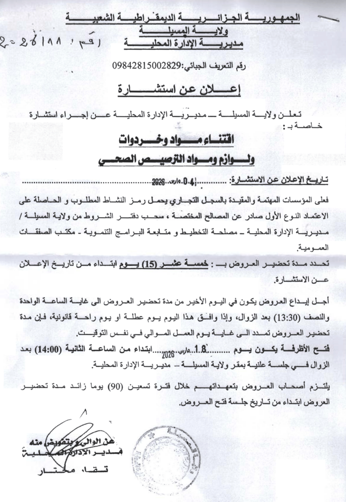إعلان عن استشارة اقتناء مواد وخردوات ولوازم الترصيص الصحي/ مديرية الإدارة المحلية لولاية المسيلة