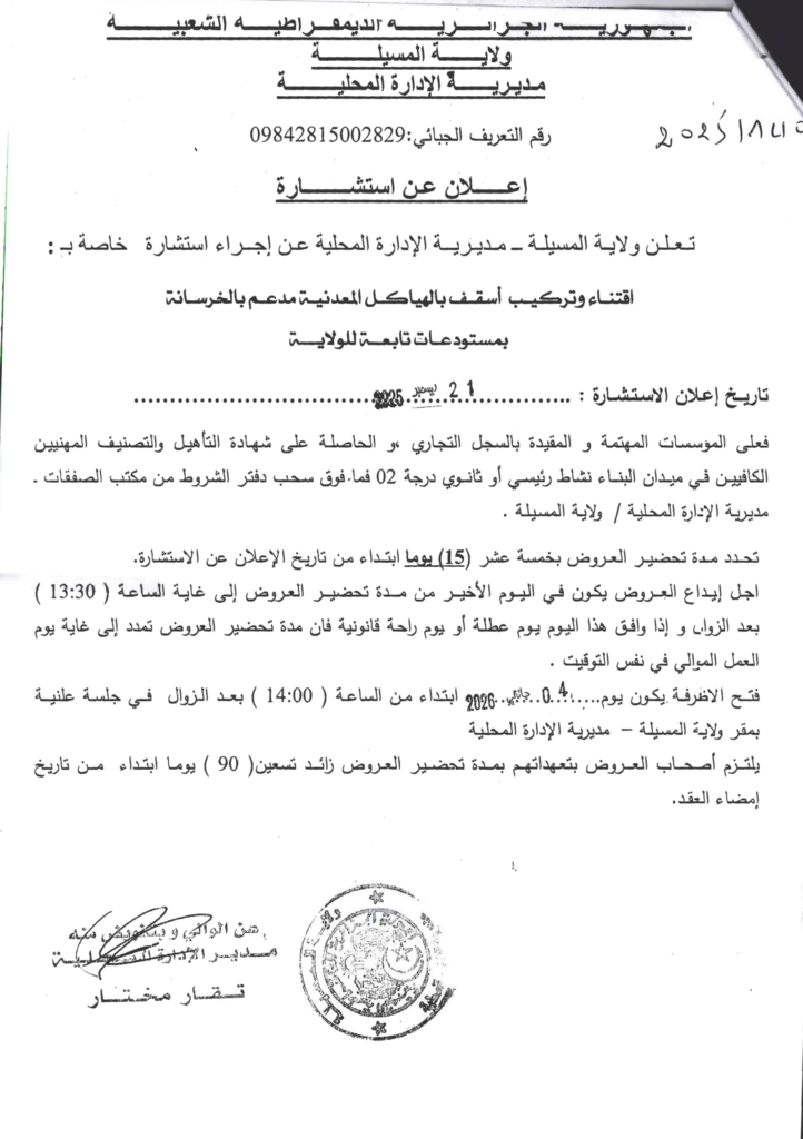 إعلان عن استشارة اقتناء وتركيب أسقف بالهياكل المعدنية مدعم بالخرسانة بمستودعات تابعة للولاية/ مديرية الإدارة المحلية لولاية المسيلة