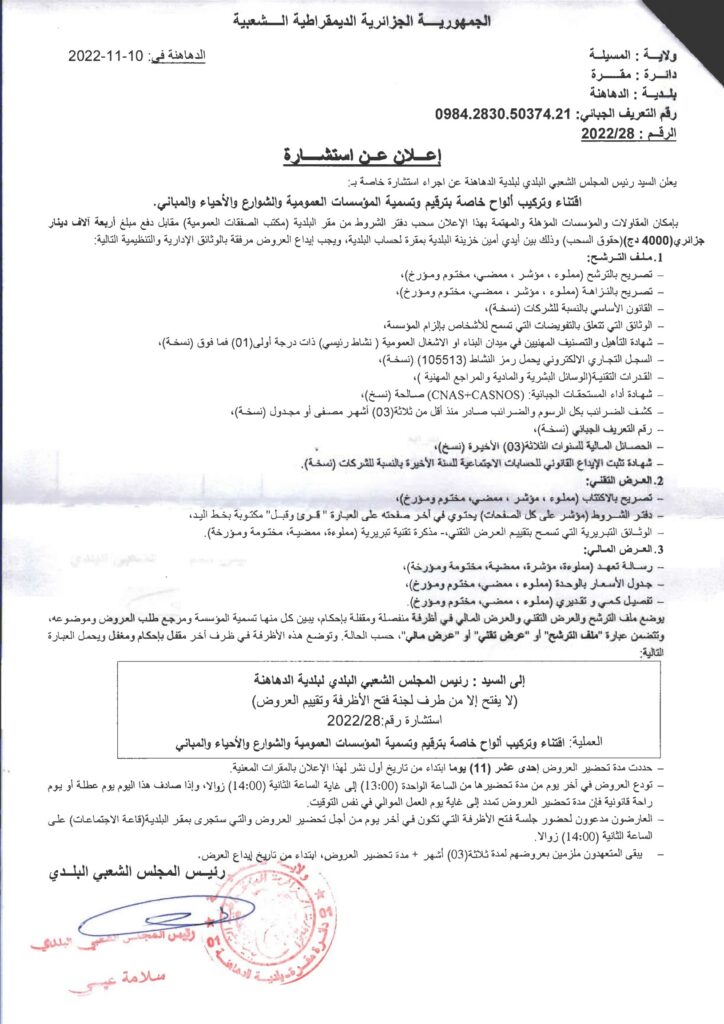إعلان عن استشارة اقتناء وتركيب ألواح خاصة بترقيم وتسمية المؤسسات العمومية والشوارع والأحياء والمباني بلدية الدهاهنة