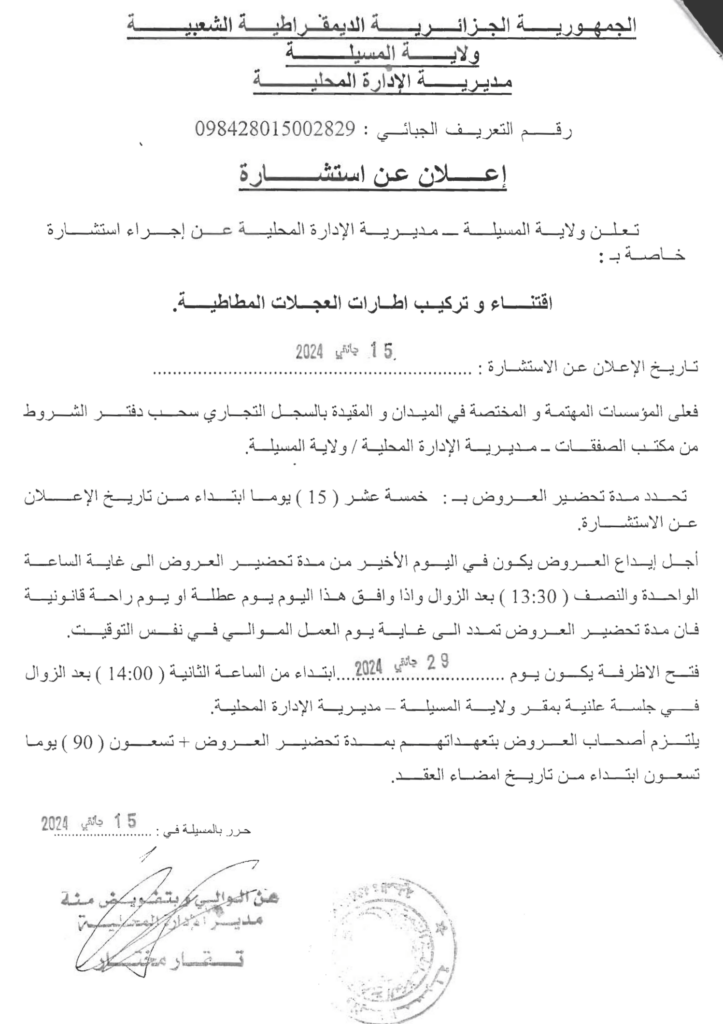 إعلان عن استشارة: اقتناء وتركيب إطارات العجلات المطاطية/ مديرية الادارة المحلية