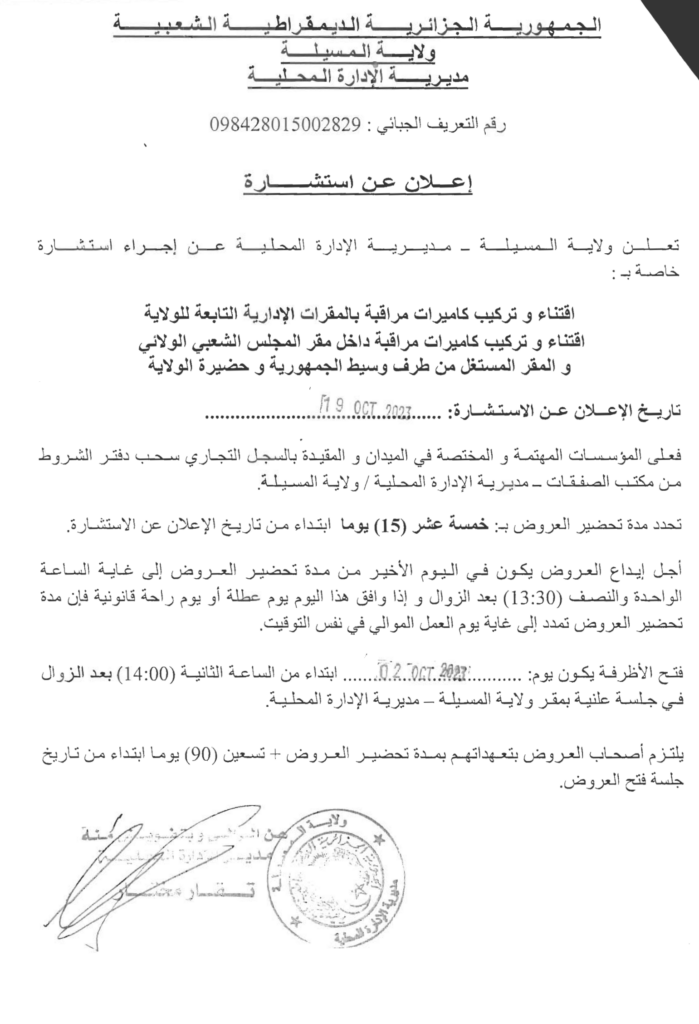 إعلان عن استشارة: اقتناء وتركيب كاميرات مراقبة بالمقرات الادارية التابعة للولاية وداخل مقر المجلس الشعبي الولائي والمقر المستغل من طرف وسيط الجمهورية وحضيرة الولاية/ مديرية الإدارة المحلية لولاية المسيلة