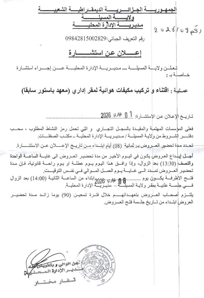 إعلان عن استشارة اقتناء وتركيب مكيفات هوائية لمقر إداري/ مديرية الإدارة المحلية لولاية المسيلة
