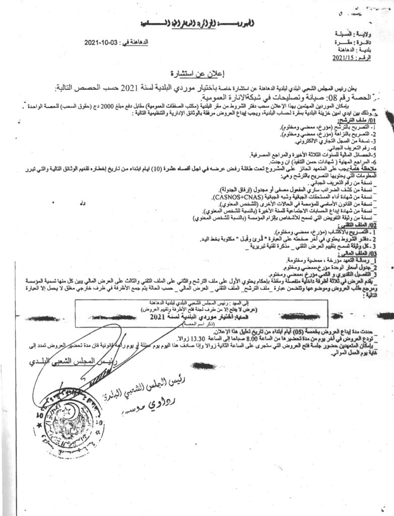 إعلان عن استشارة: الحصة رقم 08 صيانة وتصليحات في شبكة الإنارة العمومية / بلدية الدهاهنة