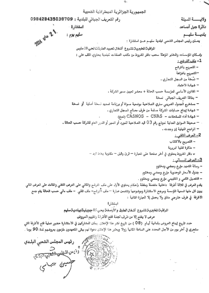 إعلان عن استشارة المراقبة المخبرية لمشروع أشغال تعبيد الطرقات لحي 19 مارس بلدية سليم