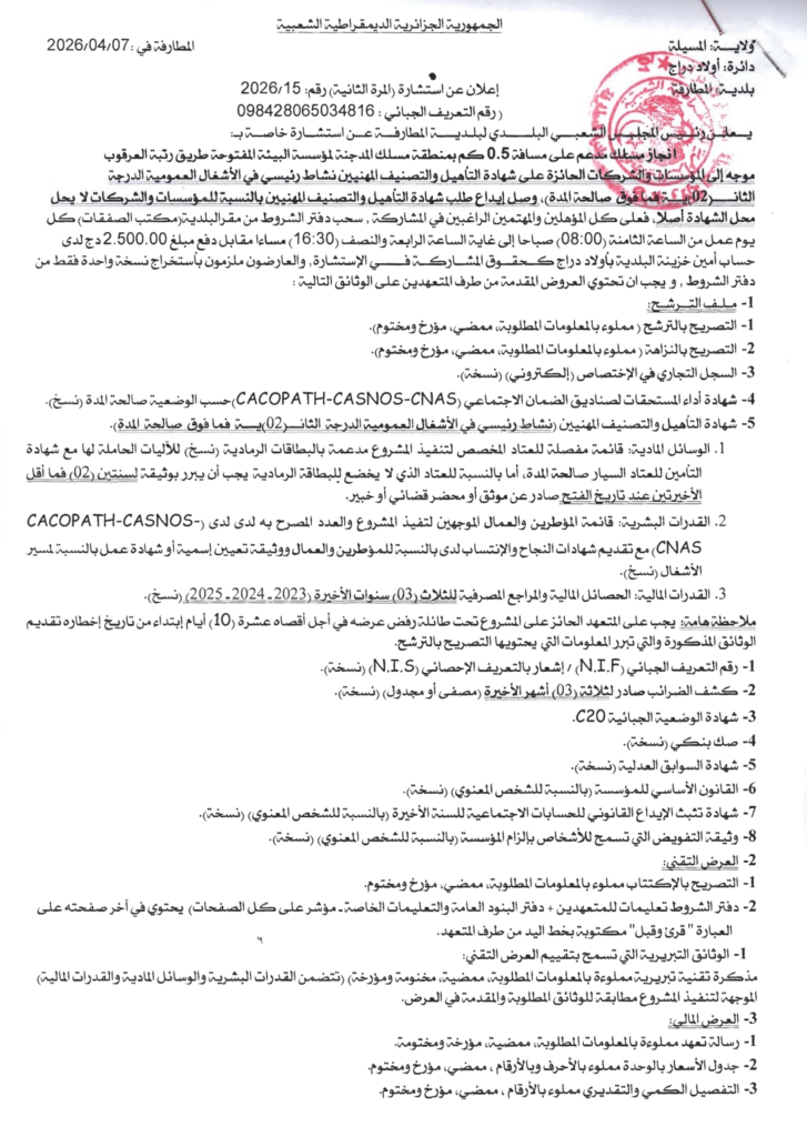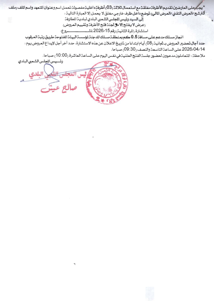 إعلان عن استشارة (المرة الثانية) 2026/15 بلدية المطارفة