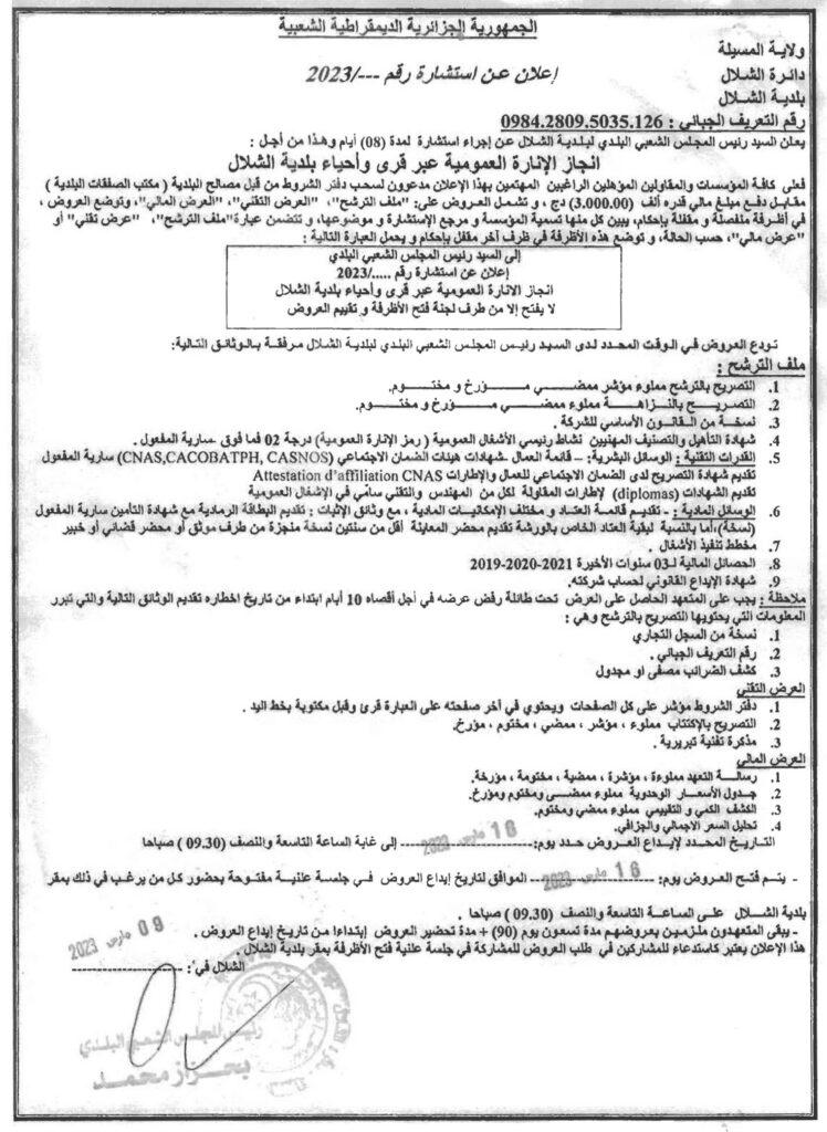 إعلان عن استشارة: انجاز الانارة العمومية عبر القرى وأحياء بلدية الشلال