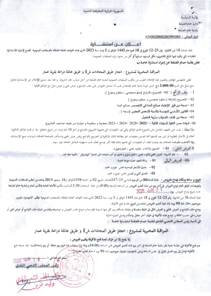 إعلان عن استشارة انجاز طريق المجادات ش1 وطريق عائلة دراعة/ بلدية حمام الضلعة