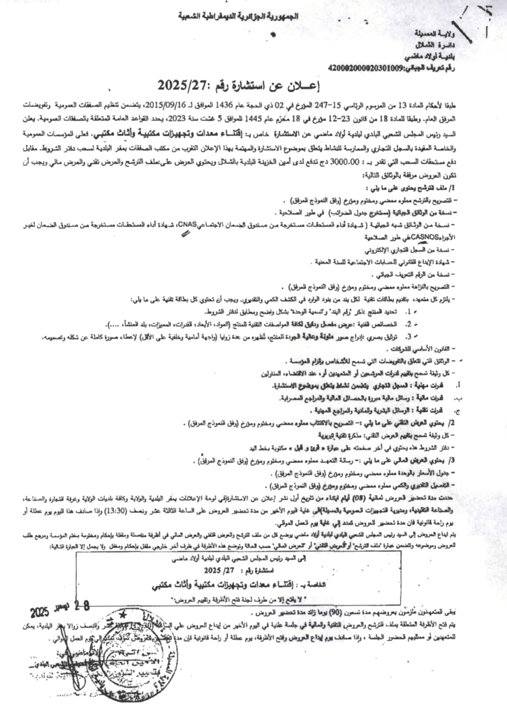 إعلان عن استشارة 2025/27 بلدية أولاد ماضي