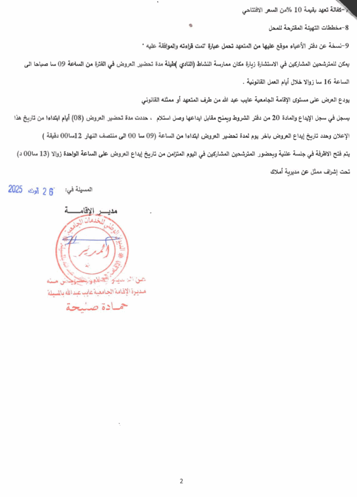 إعلان عن استشارة بالمزايدة 2025/03 الإقامة الجامعية عايب عبد الله المسيلة