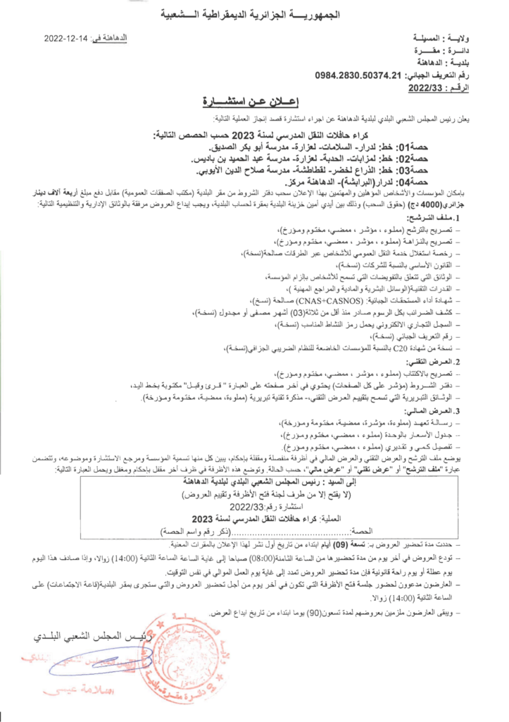 إجراء استشارة قصد انجاز العملية التالية: كراء حافلات النقل المدرسي لسنة 202314 ديسمبر، 20220 6 شاركها فيسبوك X مشاركة عبر البريد طباعة