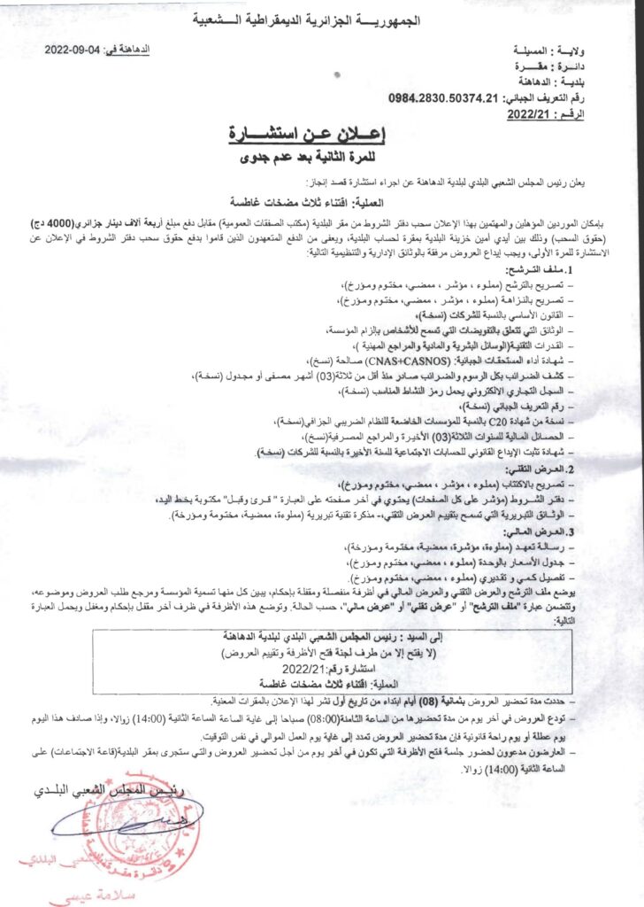 إجراء عن استشارة للمرة الثانية بعد عدم جدوى قصد انجاز : العملية اقتناء ثلاث مضخات غاطسة4 سبتمبر، 20220 9 شاركها فيسبوك X مشاركة عبر البريد طباعة