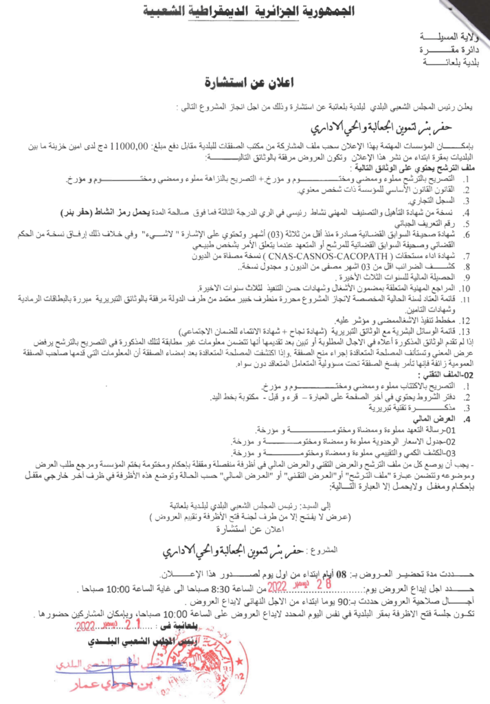 استشارة من أجل انجاز المشروع التالي: حفر بئر لتموين الجعالبة والحي الإداري25 ديسمبر، 20220 55 شاركها فيسبوك X مشاركة عبر البريد طباعة